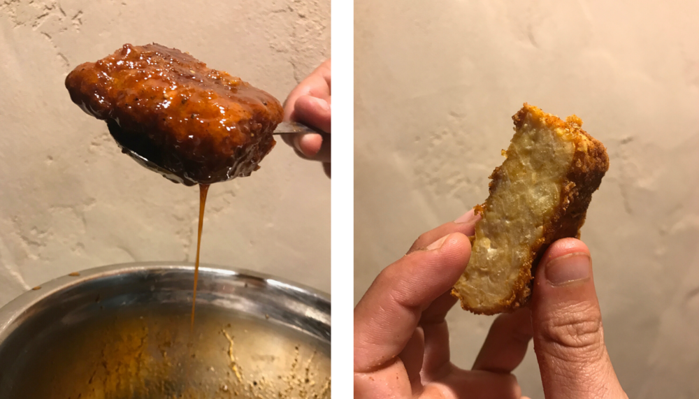 Preheat your oven to 350 degrees. Set up a wire rack on a sheet tray next to the stove, ready to place the fried tempeh on. Heat a deep cast iron pan with about 1 1/2 inches of oil—use a neutral oil for frying like canola, coconut, or vegetable oil—to 350 degrees (should be a achieved in a couple minutes on on medium high). There should be enough oil to cover the tempeh halfway up. Place your tempeh into the pan—it should sizzle—making sure not to overcrowd them. Fry on each side for about 3 minutes each. Place tempeh on your rack and finish in the oven for about 6-8 minutes. The tempeh should register an internal temperature of 165 F. Leave in the oven longer if you need to, or while you make your glaze.